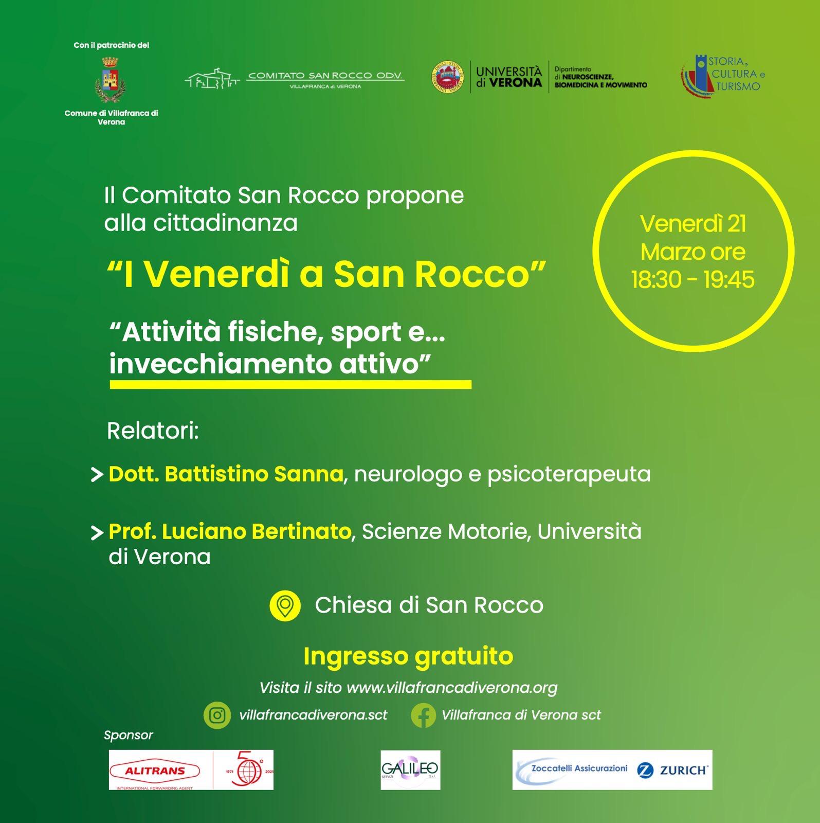 Le iniziative organizzate in questi anni sono state molteplici: convegni incentrati sul movimento che cura, i chilometri della cultura, con la valorizzazione di itinerari storico-culturali, incontri settimanali di fitness, cammino e Nordic Walking nel Parco del Tione, attività per le scuole dell’infanzia con il progetto Pedibus e "I venerdì a San Rocco". E a questo proposito, venerdì 21 marzo, dalle 18.30 alle 19.45, nella Chiesa di San Rocco a Villafranca, è in programma la conferenza Attività fisica, sport e invecchiamento attivo con i relatori Prof. Luciano Bertinato di Scienze Motorie e il Dott. Battistino Sanna, neurologo e psicoterapeuta.