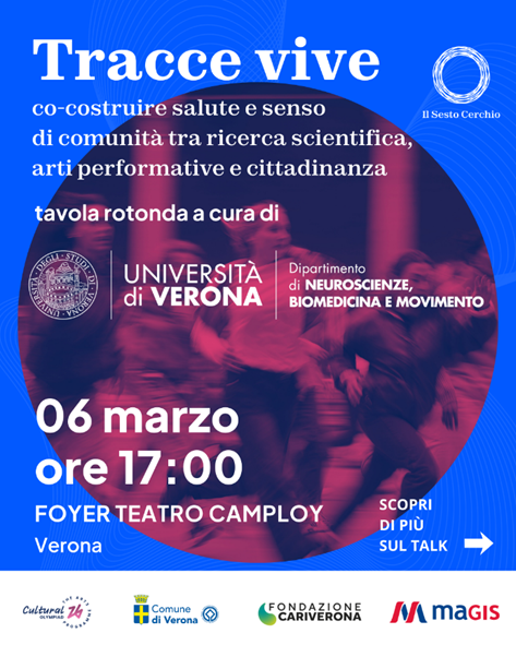 IL SESTO CERCHIO, progetto che vede la produzione esecutiva di Associazione Culturale ZEBRA Impresa Sociale ETS, nell’ambito della Cultural Olympiad, in collaborazione con il Comune di Verona e il contributo di Cariverona e Magis S.p.A., con il patrocinio del Dipartimento di Neuroscienze, Biomedicina e Movimento promuove la tavola rotonda “Tracce vive” nella convinzione che i Giochi Olimpici e Paralimpici costituiscano non solo un evento sportivo di rilevanza internazionale, ma anche un’occasione di riflessione pubblica sui concetti di salute, benessere, corpo e comunità.